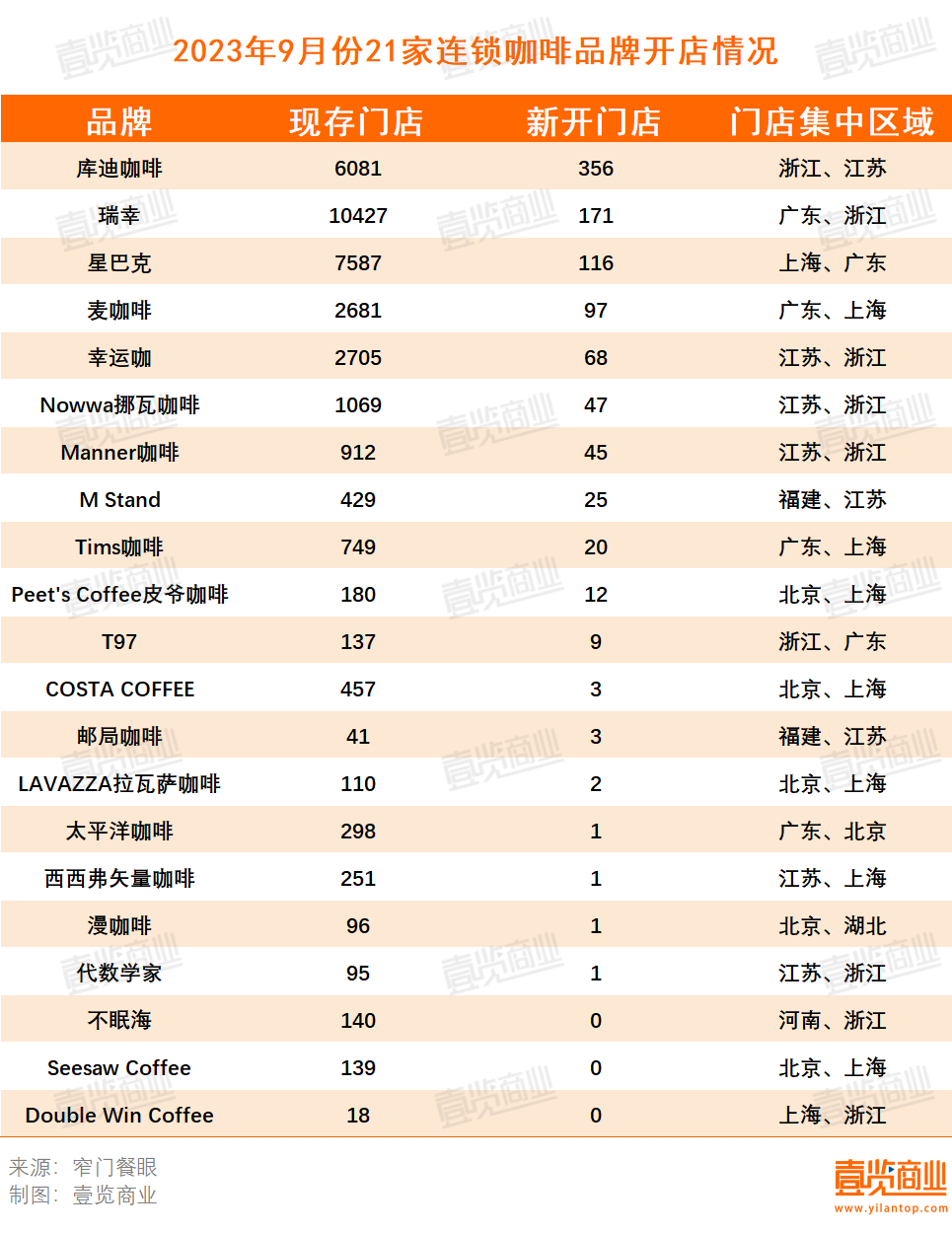 從整體開(kāi)店數(shù)量看:2023年9月份,國(guó)內(nèi)21家連鎖咖啡品牌一共新開(kāi)門店978家。現(xiàn)存門店一共38126家。