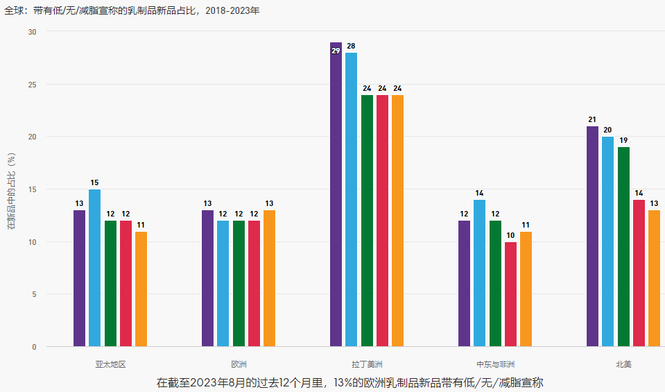 乳制品是減脂相關(guān)宣稱占比最高的食品飲料品類,在過去5年里,15%的全球乳制品新品帶有低/無/減脂宣稱。