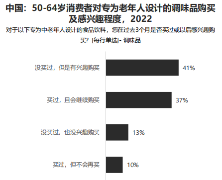 與其他品類相比,老年消費(fèi)者對于醬料和調(diào)味品的沒興趣購買的比例最低,而“沒買過專為老年人設(shè)計的產(chǎn)品,但是有興趣購買”的比例最高,可以看出這一品類在中老年中有巨大的發(fā)展?jié)摿Α?/span>