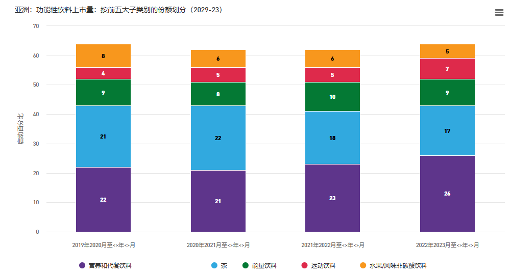 在亞洲推出的功能性飲料中,營養(yǎng)和代餐飲料以及運動飲料推出的份額有所增加。
