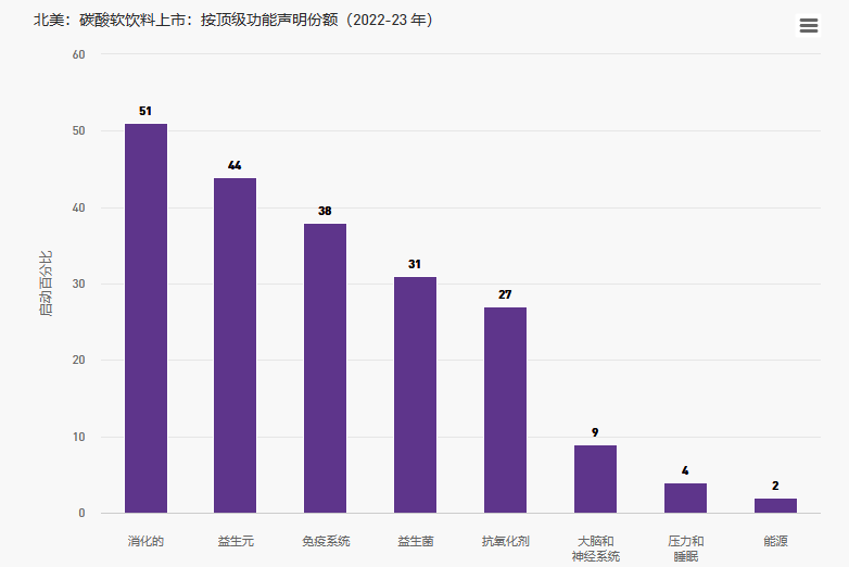 在北美推出的功能性CSD中,消化健康聲明在過去一年中出現(xiàn)在超過一半的介紹中。其中大部分是由Poppi和Rebbl Pop等快速增長的品牌推出的,這些品牌刺激了益生元,益生菌和消化聲明的軟飲料的增長。