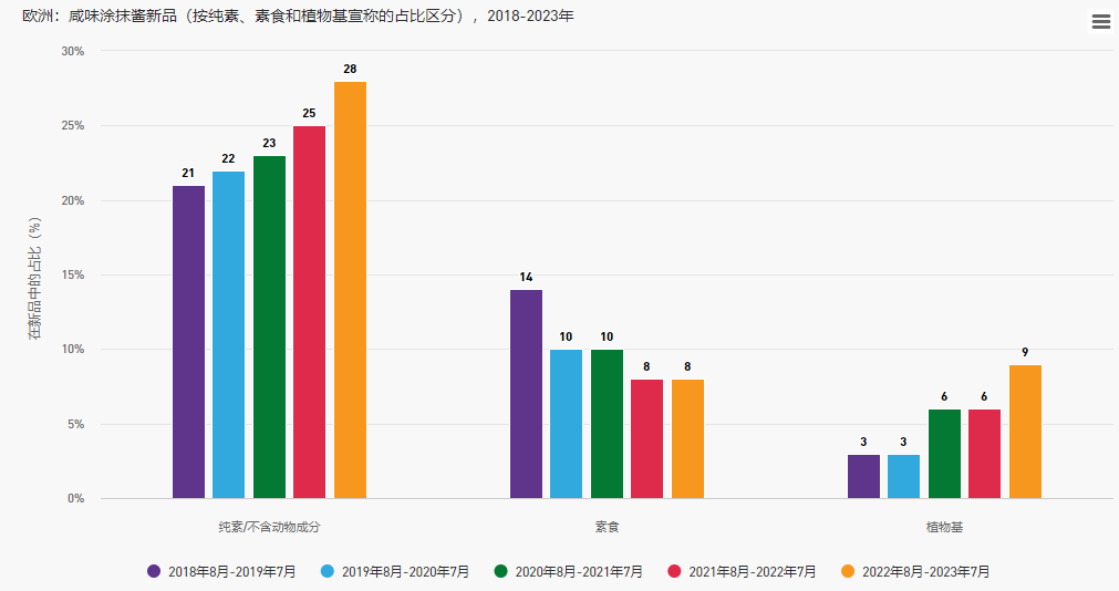 不含動(dòng)物成分的趨勢在咸味植物涂抹醬和三明治夾心子品類中尤為顯著,該品類中的植物基和純素新品在近幾年大幅增加。