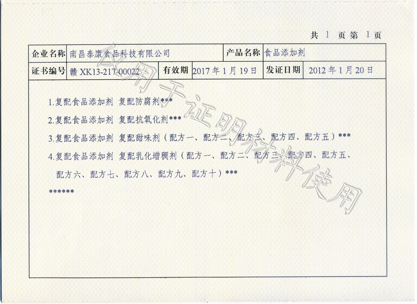 2012年1月20日,我公司順利獲得了由省質監(jiān)局頒發(fā)的食品添加劑生產許可證書。