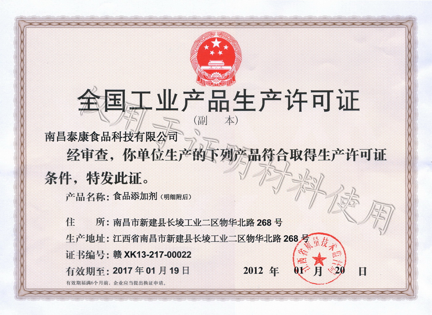 萬象更新氣勢新,新年伊始,從江西省質量技術監(jiān)督局傳來喜訊,經過近5個月的努力,日前,我公司生產的復配食品添加劑產品通過了國家工業(yè)產品生產許可證企業(yè)審核,順利獲得由江西省質量技術監(jiān)督局批準頒發(fā)的《全國工業(yè)產品生產許可證》(證號:贛XK13-217-00022),產品為食品添加劑,包含復配甜味劑、復配防腐劑、復配抗氧化劑、復配乳化增稠劑等產品。