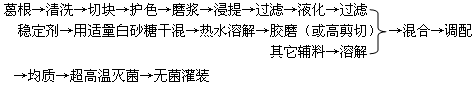 (1)清洗:在流水池中用刷子清洗葛根表皮上的泥土,并切去干縮,病蟲污染及霉?fàn)€變質(zhì)部分。 (2)磨漿:將葛切碎塊后,放入異Vc―Na護(hù)色液中。護(hù)色液重為葛重的1.8倍。打漿機(jī)打漿,靜置。調(diào)節(jié)護(hù)色液的pH值為6.0、靜置時(shí)間80分鐘,靜置溫度